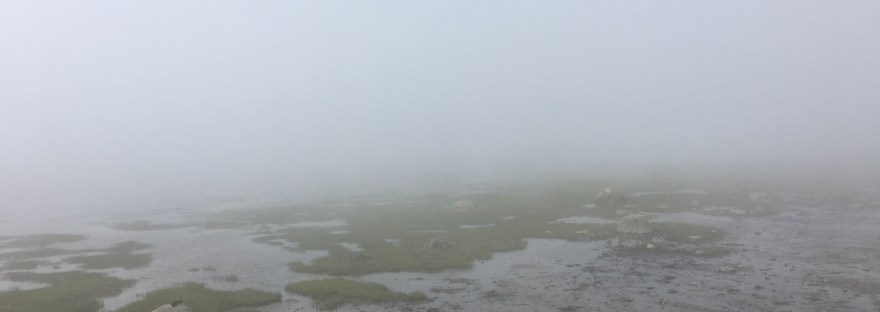 Si elles sont certainement très différentes, ne serait-ce que de par les sensations physiques qu’elles entraînent (je pense notamment au son de la nuit, où les animaux prennent généralement plus de place que les humains, mais aussi au picotement froid que cause le banc de brouillard où l’on entre), ces deux « atmosphères » ont en commun d’envelopper le paysage, de dérober une partie (ou la totalité) de ce dernier. Même si la densité de la brume varie avec le temps et le vent, offre des degrés de transparence changeants… la nuit, de la même façon, est plus ou moins claire en fonction des nuages et de la lune.